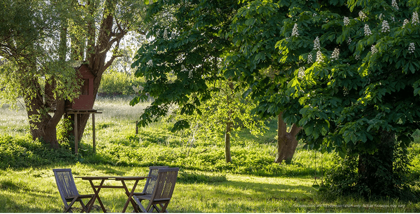 Landscaped lawn and seating zones.