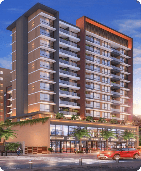 - G+11 storey tower with residential and select commercial spaces, including shops and offices on lower floors, indicative of a Commercial and residential building by Bhagwati Group.